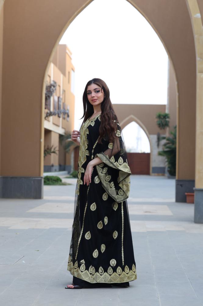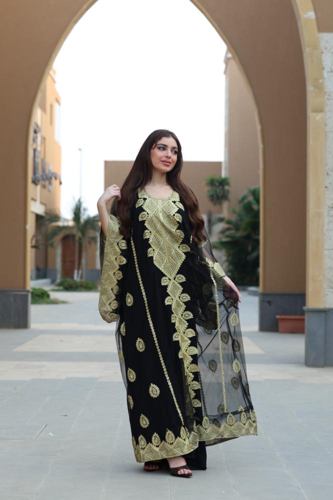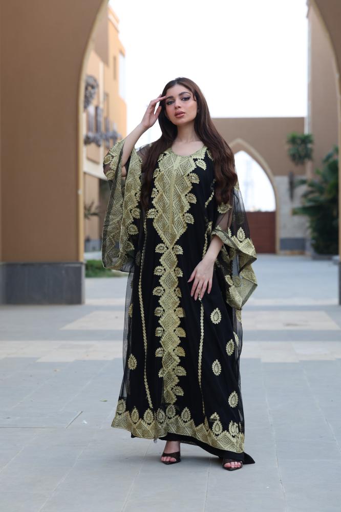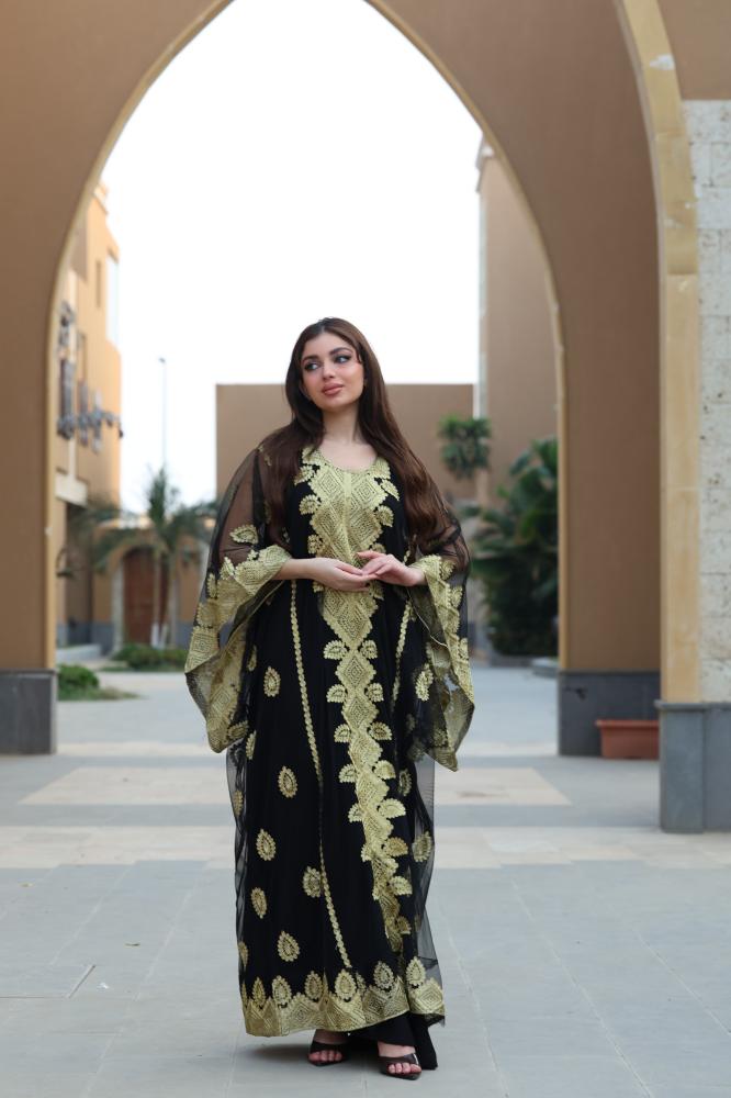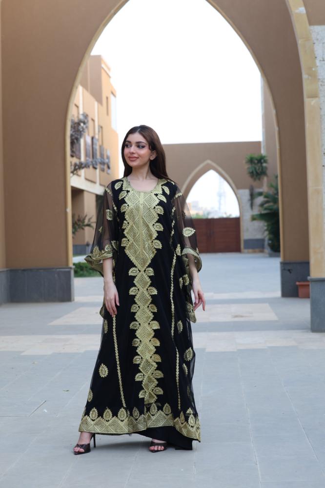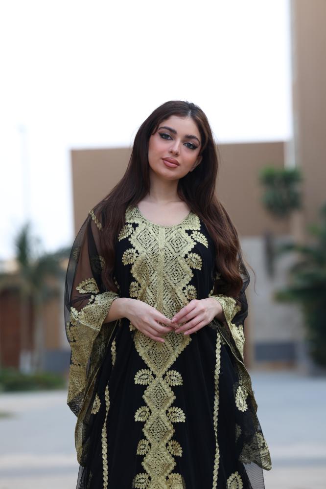 مواصفات جلابية مطرزة سوداء بخامة التل