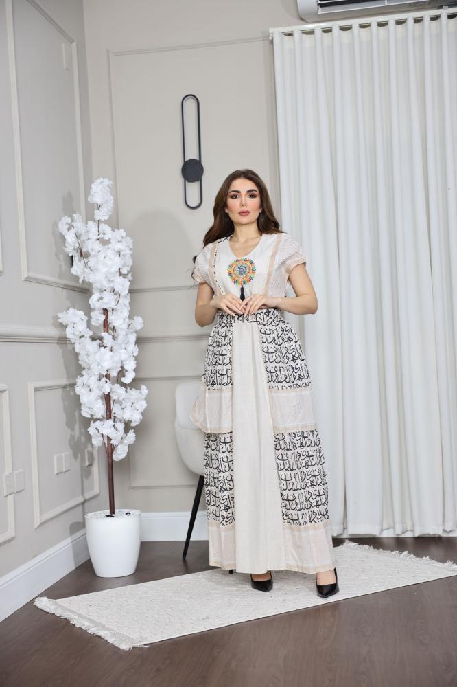 جلابية رمضانية الرائعة المزينة بنقوش الحروف العربية تصميمها الفريد يعكس التراث العربي الأصيل ويضفي لمسة من الفخامة على إطلالتك.