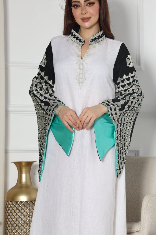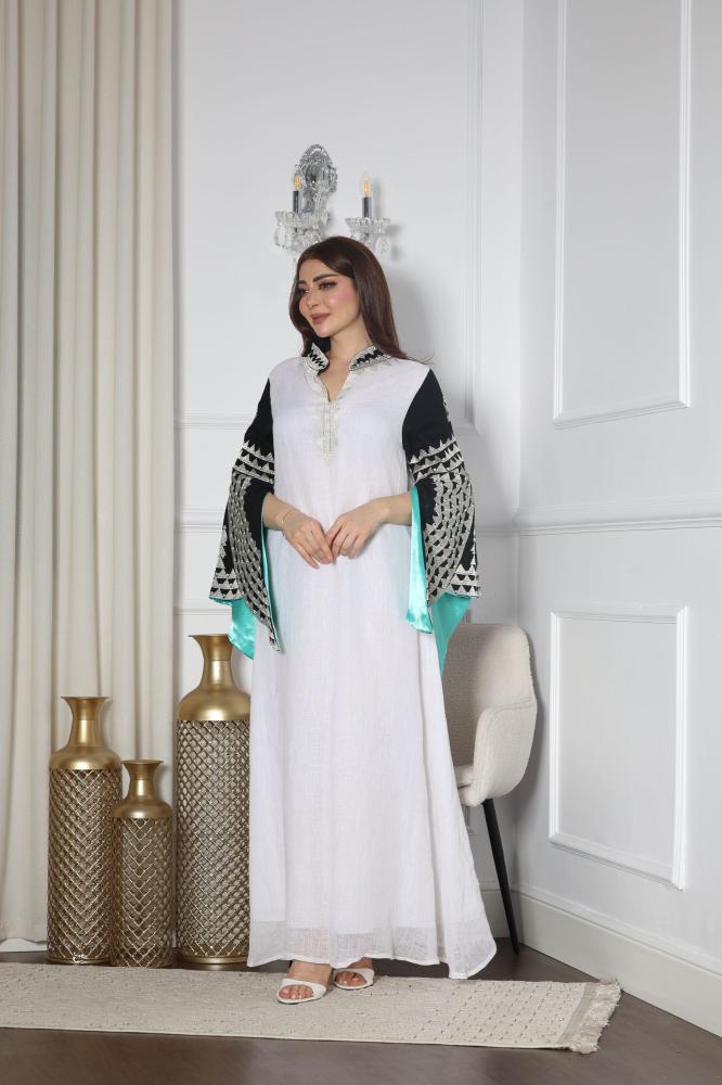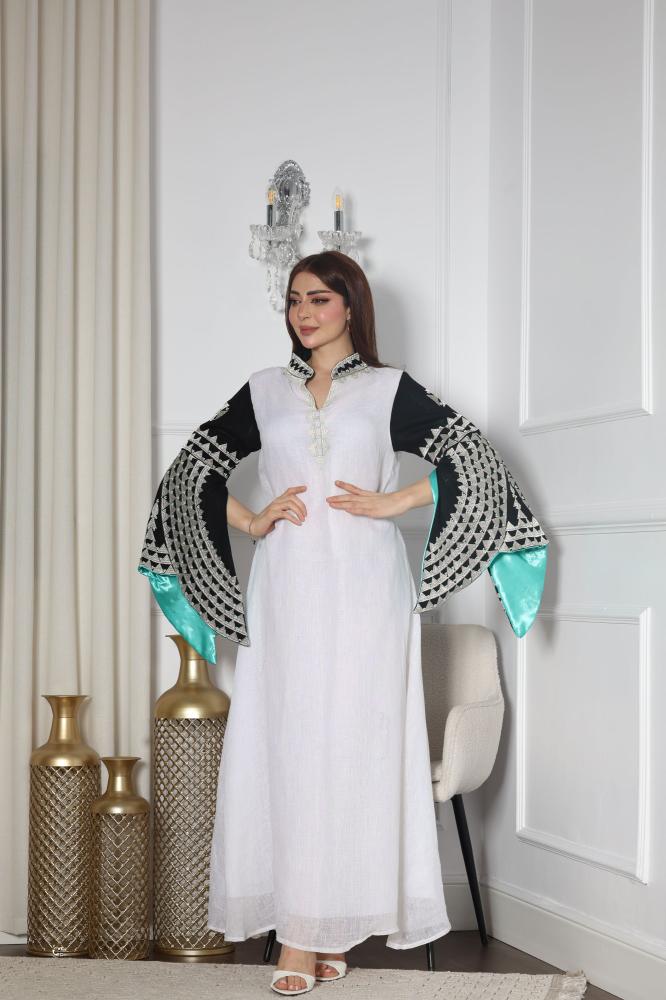 بإطلالة أنيقة ومريحة مع جلابيه لينن بتطريز كمبيوتر وتطريز شك التي تجمع بين الراحة والفخامة تضفي لمسة من الأناقة على مظهرك بفضل التصميم العصري والتفاصيل الفريدة.